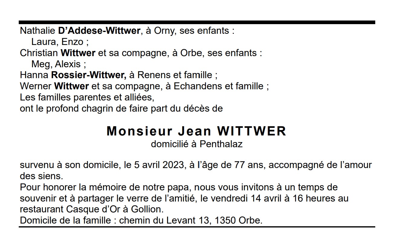 Monsieur Jean WITTWER domicilié à Penthalaz 25 fév. 1946 - 05 avr. 2023 Avis mortuaire PFG Télecharger PDF Partager sur: Galerie PreviousNext PreviousNext