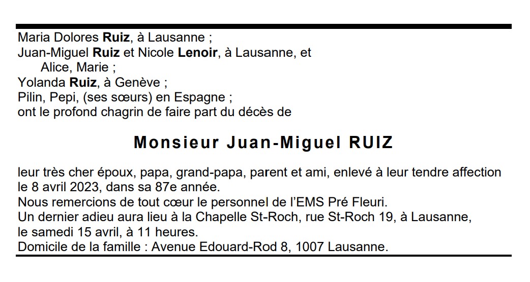 Monsieur Juan-Miguel RUIZ 14 oct. 1936 - 08 avr. 2023 Avis mortuaire PFG Télecharger PDF Partager sur: Galerie PreviousNext PreviousNext