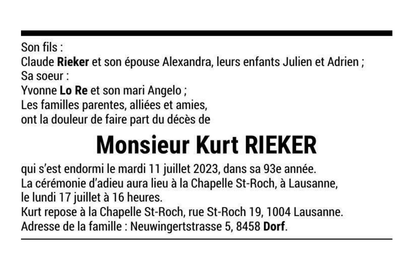 Monsieur Kurt RIEKER 14 juin. 1931 - 11 juil. 2023 Avis mortuaire PFG Télecharger PDF Partager sur: Galerie PreviousNext PreviousNext