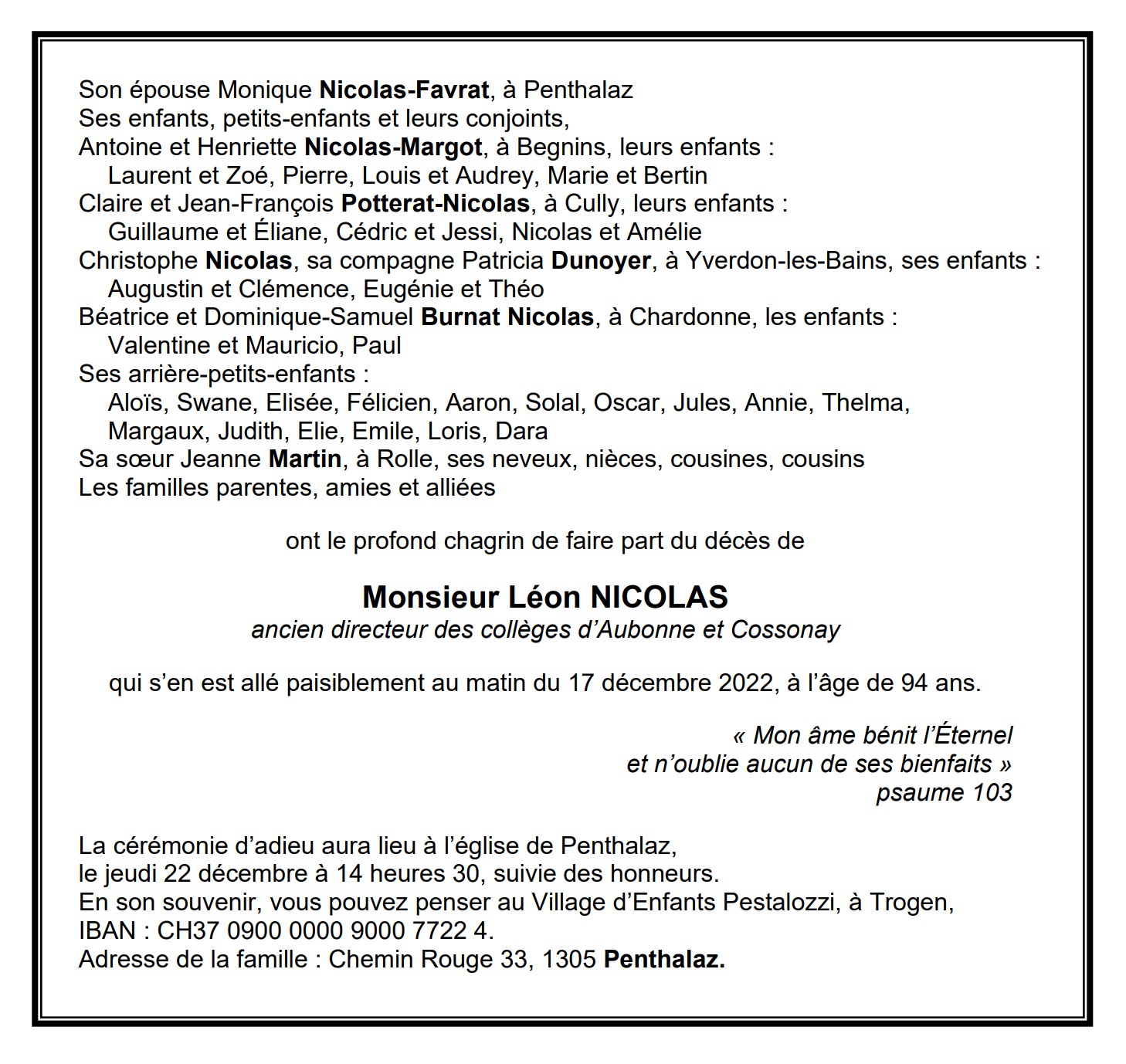 Monsieur Léon NICOLAS 05 sep. 1928 - 17 déc. 2022 Avis mortuaire PFG Télecharger PDF Partager sur: Galerie PreviousNext PreviousNext