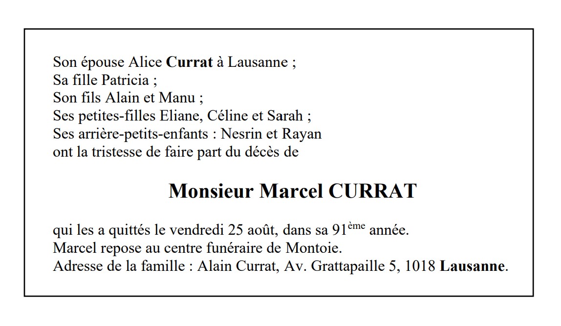 Monsieur Marcel CURRAT 03 nov. 1932 - 25 aoû. 2023 Avis mortuaire PFG Télecharger PDF Partager sur: Galerie PreviousNext PreviousNext