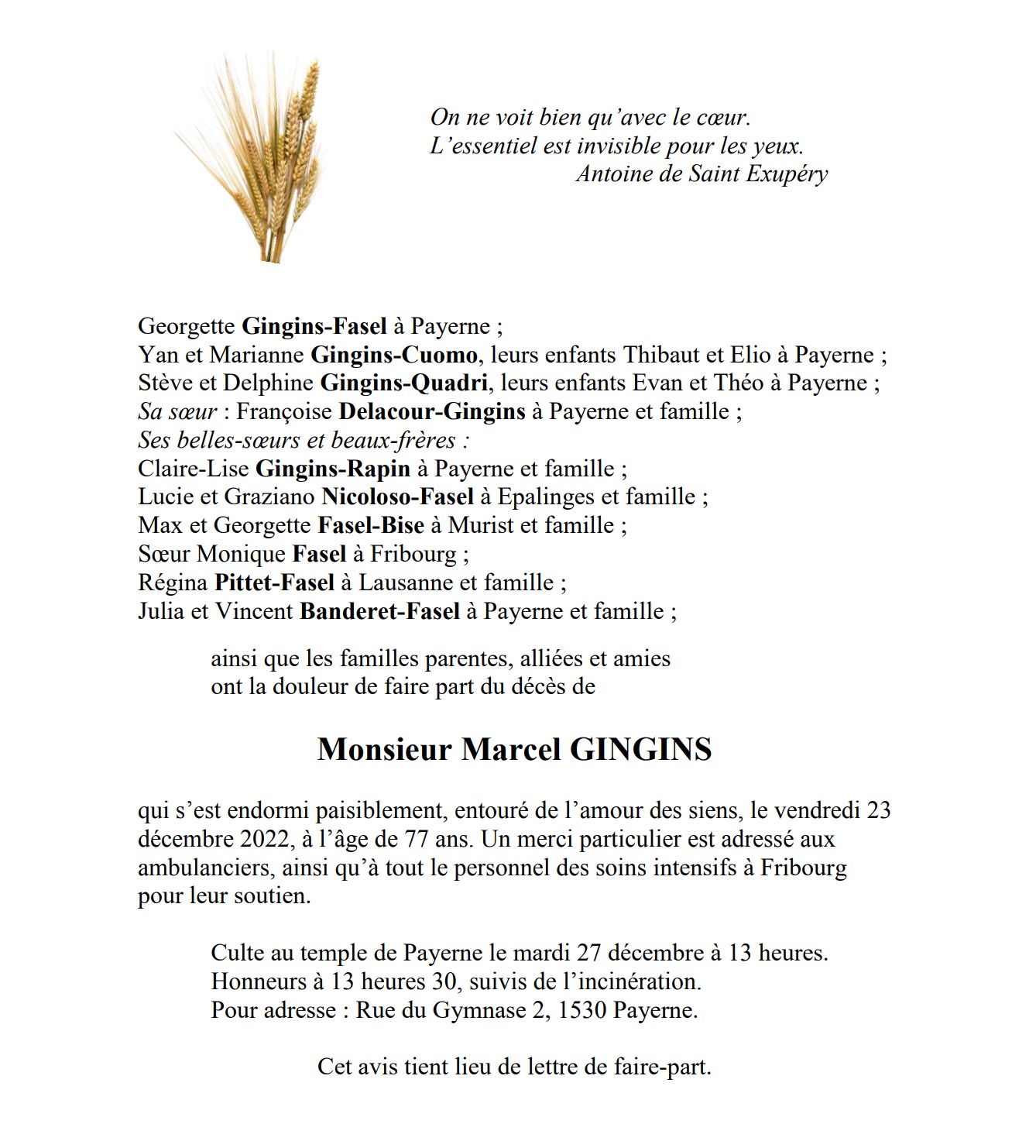 Monsieur Marcel GINGINS 18 sep. 1945 - 23 déc. 2022 Avis mortuaire PFG Télecharger PDF Partager sur: Galerie PreviousNext PreviousNext