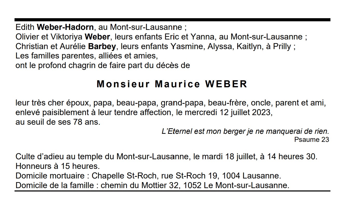 Monsieur Maurice WEBER 26 juil. 1945 - 12 juil. 2023 Avis mortuaire PFG Télecharger PDF Partager sur: Galerie PreviousNext PreviousNext