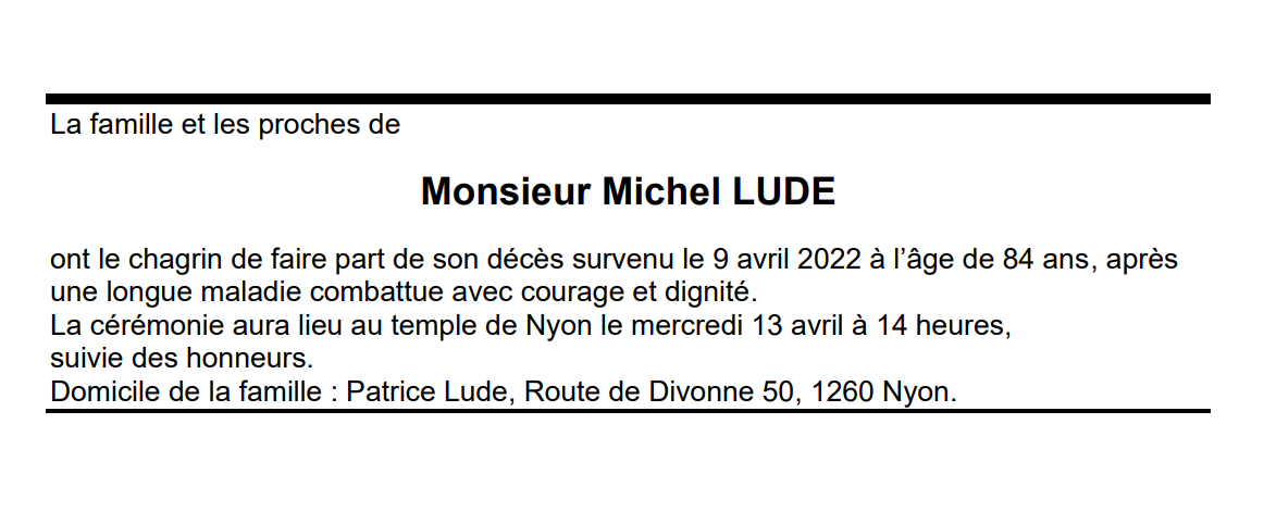 Monsieur Michel LUDE 28 mar. 1938 - 09 avr. 2022 Avis mortuaire PFG Télecharger PDF Partager sur: Galerie PreviousNext PreviousNext