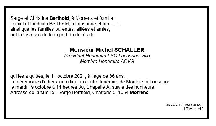 Monsieur Michel SCHALLER 10 déc. 1934 - 11 oct. 2021 Avis mortuaire PFG Télecharger PDF Partager sur: Galerie PreviousNext PreviousNext