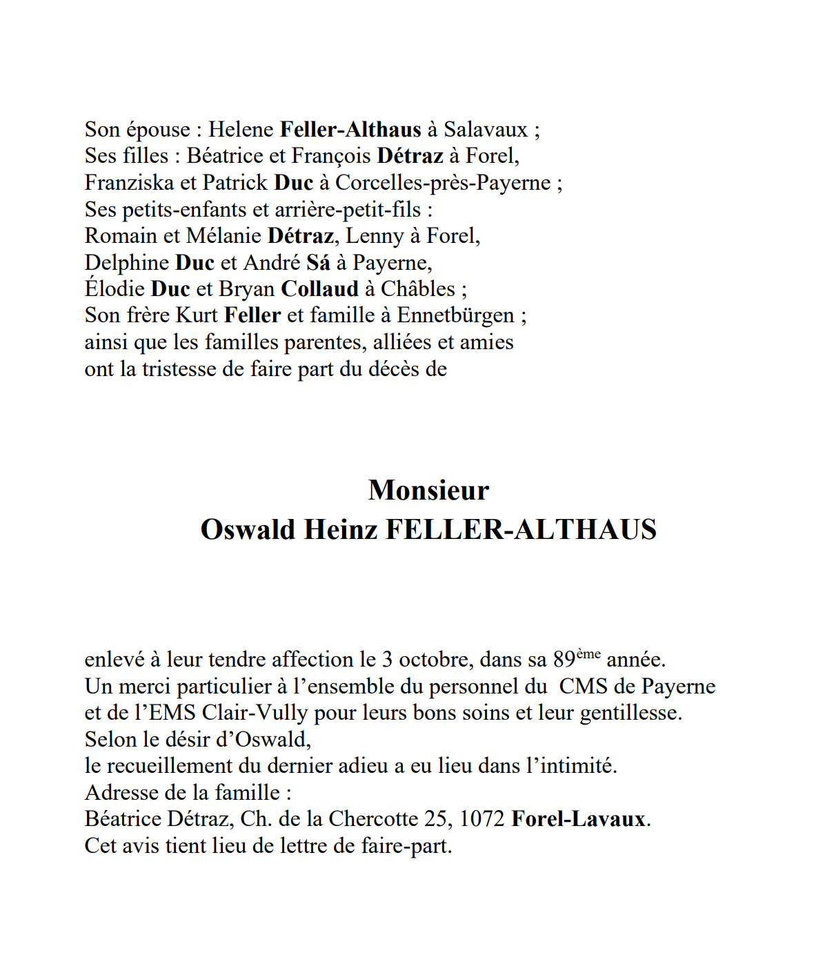 Monsieur Oswald Heinz FELLER-ALTHAUS 25 déc. 1934 - 03 oct. 2023 Avis mortuaire PFG Télecharger PDF Partager sur: Galerie