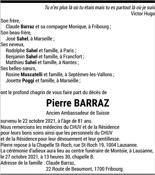 Monsieur Pierre BARRAZ 04 sep. 1940 - 22 oct. 2021 Avis mortuaire PFG Télecharger PDF Partager sur: Galerie PreviousNext PreviousNext