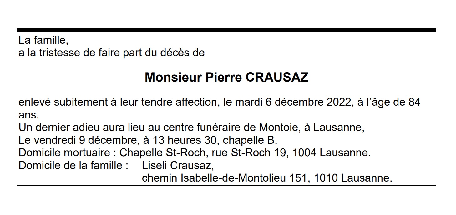 Monsieur Pierre CRAUSAZ 04 mai. 1938 - 06 déc. 2022 Avis mortuaire PFG Télecharger PDF Partager sur: Galerie PreviousNext PreviousNext