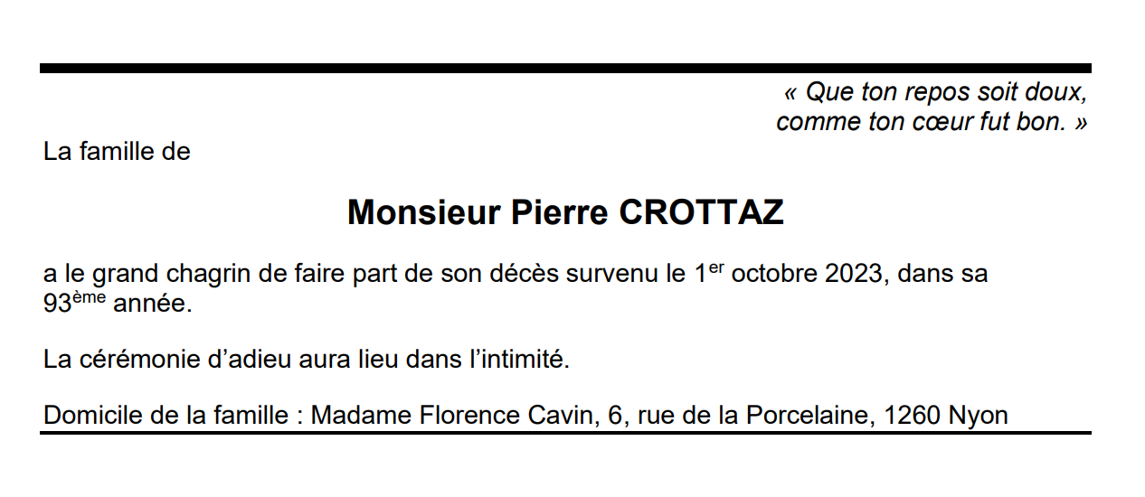 Monsieur Pierre CROTTAZ 21 oct. 1930 - 03 oct. 2023 Avis mortuaire PFG Télecharger PDF Partager sur: Galerie PreviousNext PreviousNext