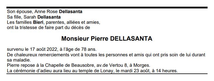 Monsieur Pierre DELLASANTA 22 fév. 1944 - 17 aoû. 2022 Avis mortuaire PFG Télecharger PDF Partager sur: Galerie PreviousNext PreviousNext
