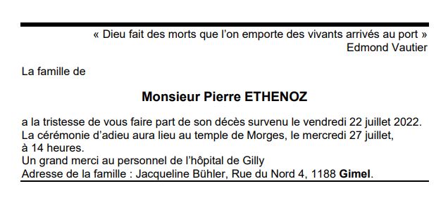 Monsieur Pierre ETHENOZ 19 nov. 1938 - 22 juil. 2022 Avis mortuaire PFG Télecharger PDF Partager sur: Galerie PreviousNext PreviousNext