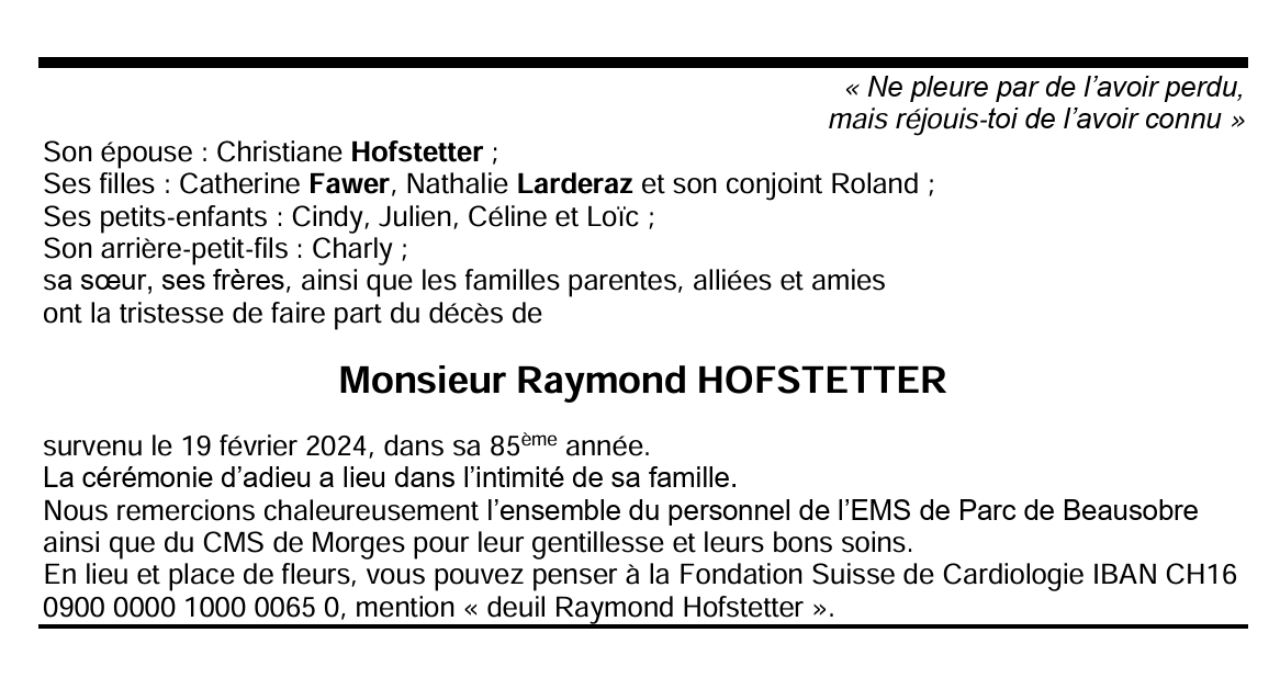 Monsieur Raymond HOFSTETTER 27 aoû. 1939 - 19 fév. 2024 Avis mortuaire PFG Télecharger PDF Partager sur: Galerie PreviousNext PreviousNext
