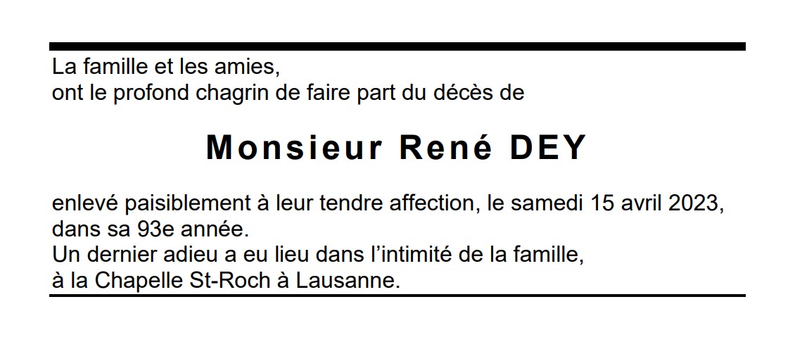 Monsieur René DEY 27 fév. 1931 - 15 avr. 2023 Avis mortuaire PFG Télecharger PDF Partager sur: Galerie PreviousNext PreviousNext