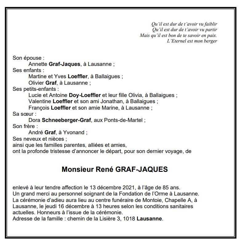 Monsieur René GRAF-JAQUES 06 aoû. 1936 - 13 déc. 2021 Avis mortuaire PFG Télecharger PDF Partager sur: Galerie PreviousNext PreviousNext