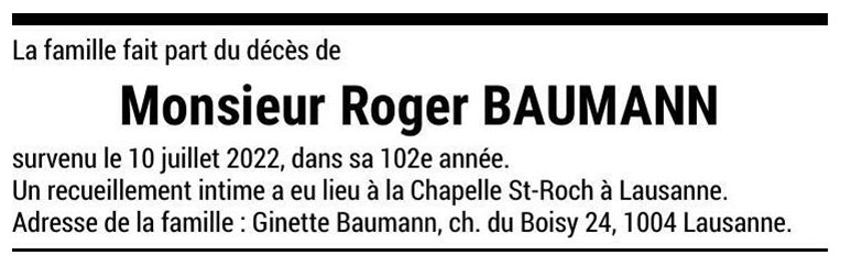 Monsieur Roger BAUMANN 26 déc. 1920 - 13 juil. 2022 Avis mortuaire PFG Télecharger PDF Partager sur: Galerie PreviousNext PreviousNext