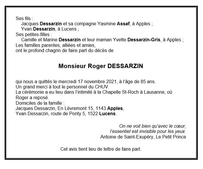 Monsieur Roger DESSARZIN 26 juin. 1936 - 17 nov. 2021 Avis mortuaire PFG Télecharger PDF Partager sur: Galerie PreviousNext PreviousNext