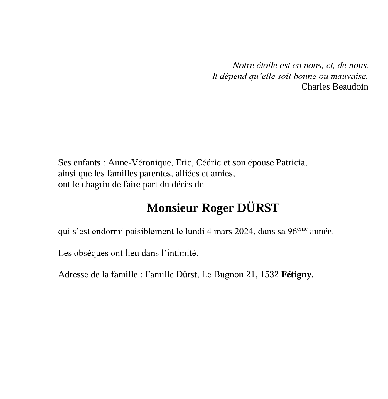 Monsieur Roger DÜRST 09 juin. 1928 - 04 mar. 2024 Avis mortuaire PFG Télecharger PDF Partager sur: Galerie