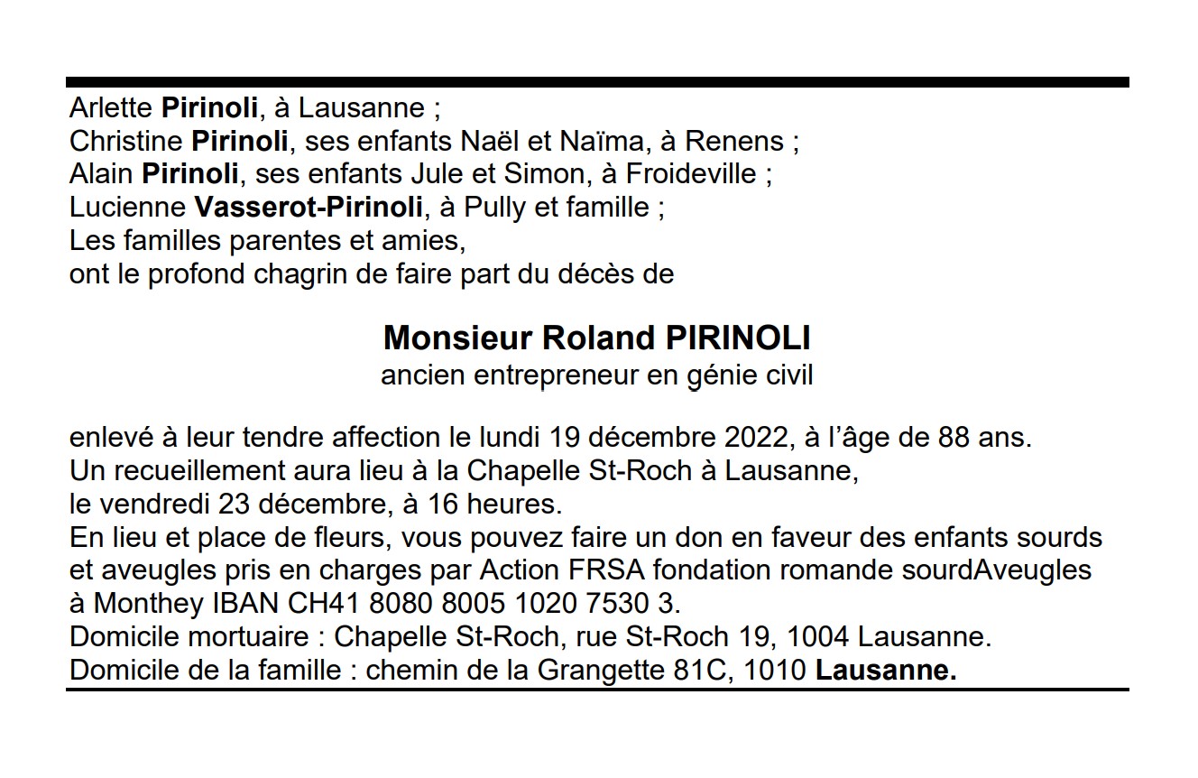 Monsieur Roland PIRINOLI 20 oct. 1934 - 19 déc. 2022 Avis mortuaire PFG Télecharger PDF Partager sur: Galerie PreviousNext PreviousNext