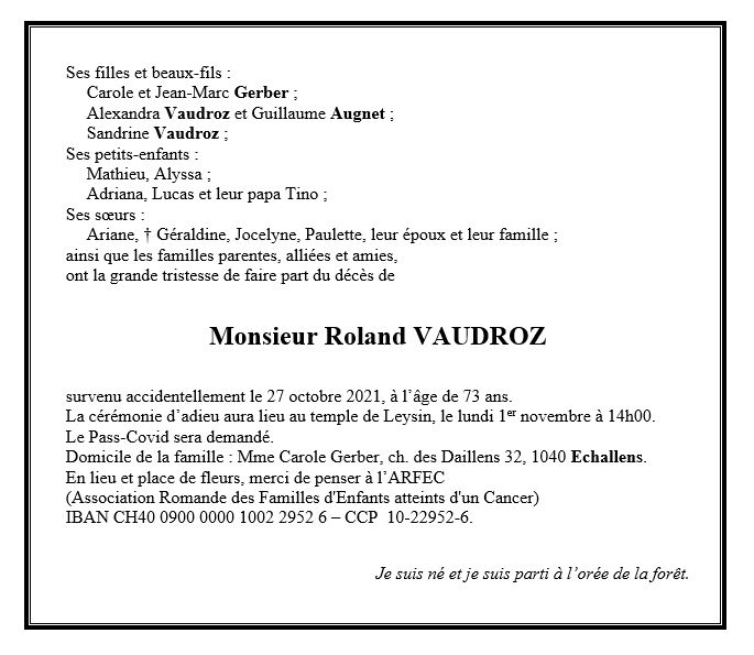 Monsieur Roland VAUDROZ 29 juil. 1948 - 27 oct. 2021 Avis mortuaire PFG Télecharger PDF Partager sur: Galerie PreviousNext PreviousNext