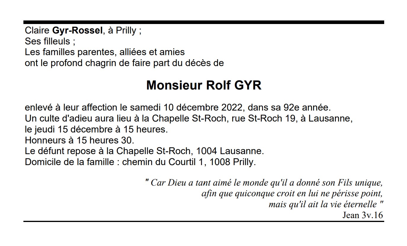 Monsieur Rolf GYR 17 fév. 1931 - 10 déc. 2022 Avis mortuaire PFG Télecharger PDF Partager sur: Galerie PreviousNext PreviousNext