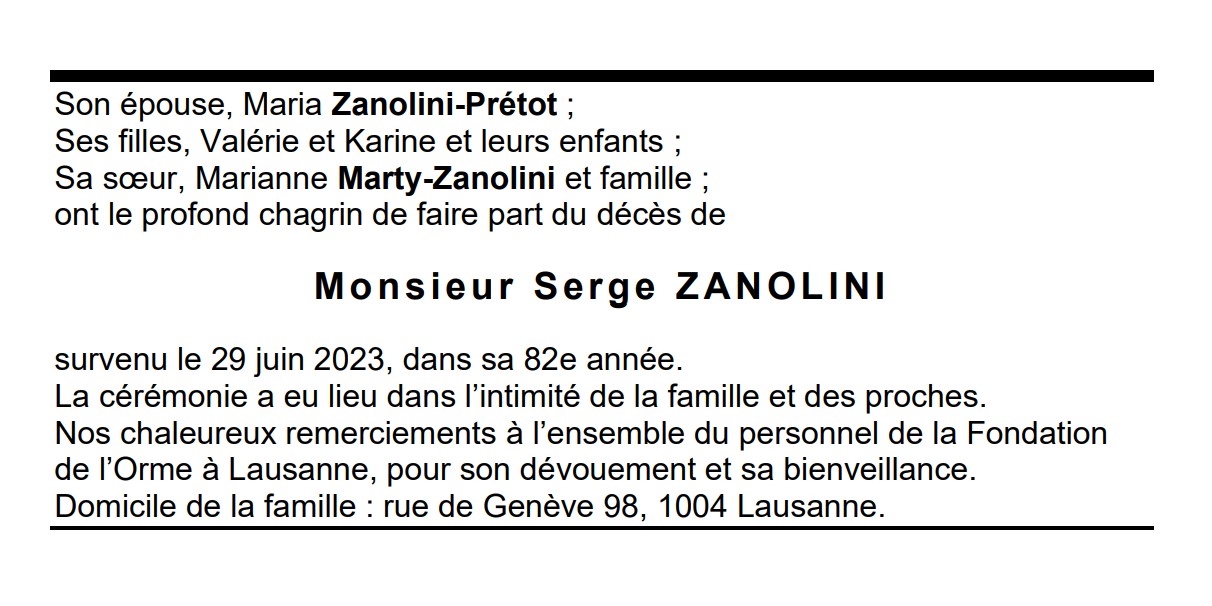 Monsieur Serge ZANOLINI 08 juin. 1942 - 29 juin. 2023 Avis mortuaire PFG Télecharger PDF Partager sur: Galerie PreviousNext PreviousNext