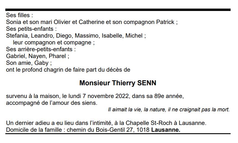 Monsieur Thierry SENN 23 avr. 1934 - 07 nov. 2022 Avis mortuaire PFG Télecharger PDF Partager sur: Galerie PreviousNext PreviousNext