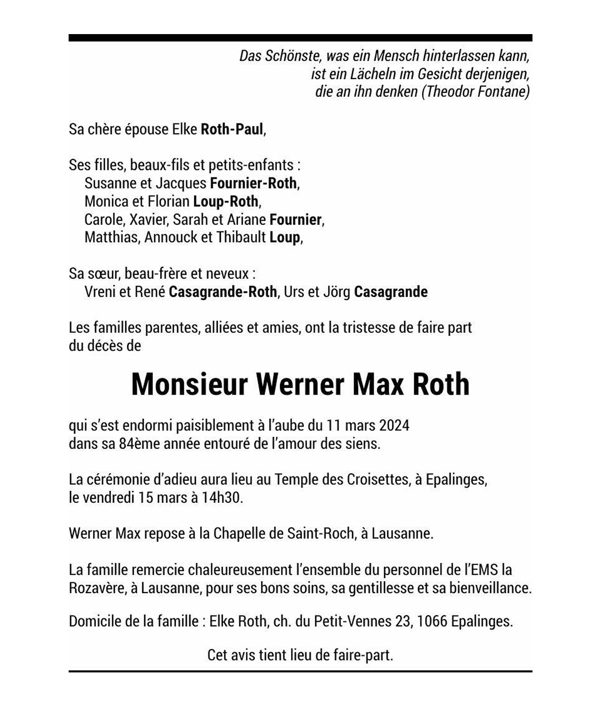 Monsieur Werner Max Roth 12 avr. 1940 - 11 mar. 2024 Avis mortuaire PFG Télecharger PDF Partager sur: Galerie PreviousNext PreviousNext