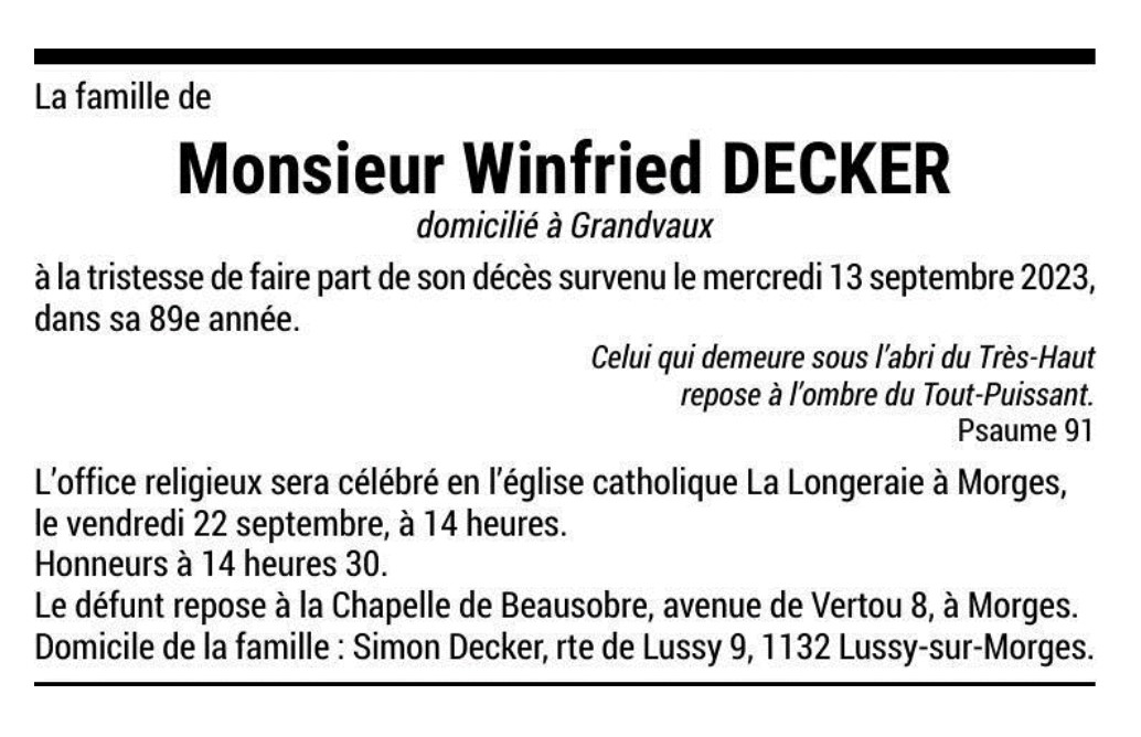 Monsieur Winfried DECKER 06 jan. 1935 - 13 sep. 2023 Avis mortuaire PFG Télecharger PDF Partager sur: Galerie PreviousNext PreviousNext