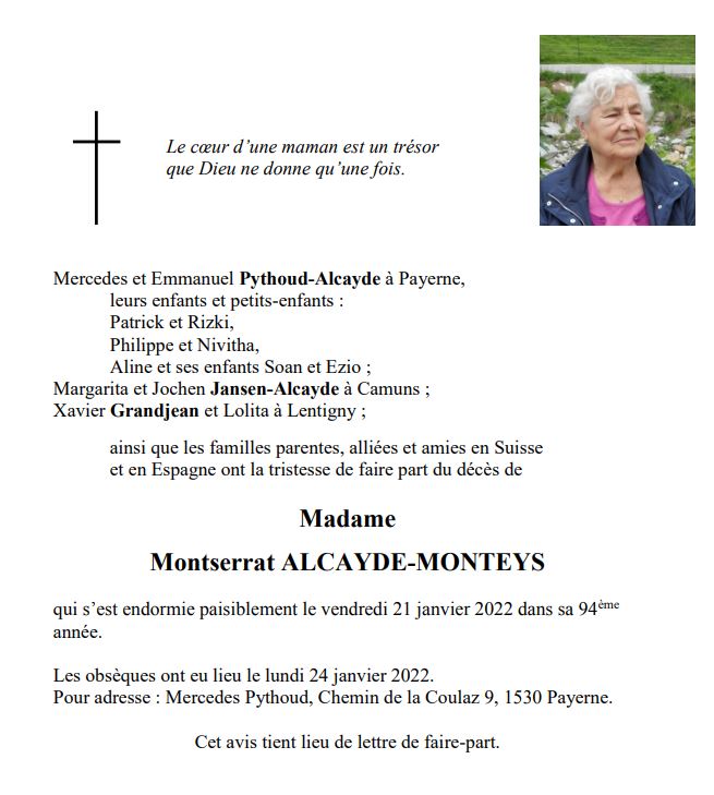 Montserrat ALCAYDE-MONTEYS 21 fév. 1928 - 21 jan. 2022 Avis mortuaire PFG Télecharger PDF Partager sur: Galerie PreviousNext PreviousNext