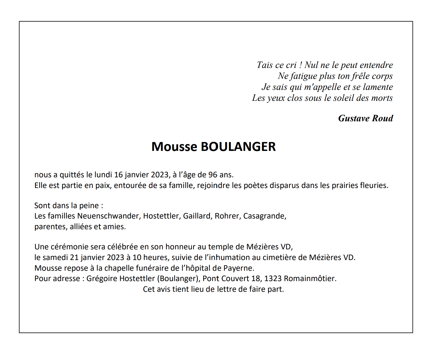Mousse BOULANGER 03 nov. 1926 - 16 jan. 2023 Avis mortuaire PFG Télecharger PDF Partager sur: Galerie PreviousNext PreviousNext