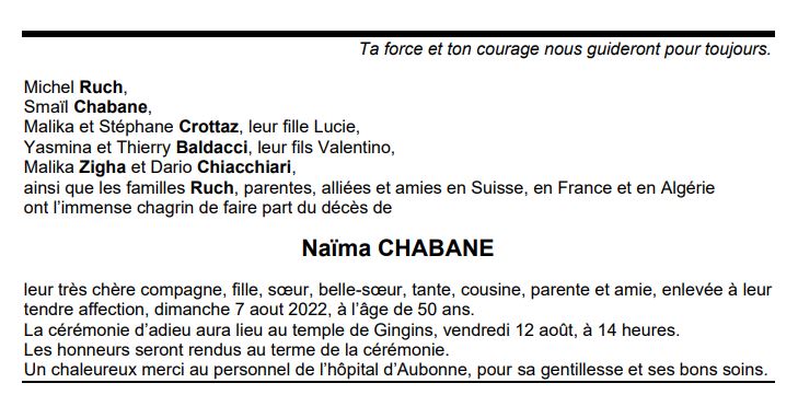 Naïma CHABANE 26 fév. 1972 - 07 aoû. 2022 Avis mortuaire PFG Télecharger PDF Partager sur: Galerie PreviousNext PreviousNext