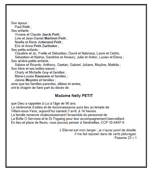 Nelly PETIT 17 jan. 1931 - 31 mar. 2021 Avis mortuaire PFG Télecharger PDF Partager sur: Galerie PreviousNext PreviousNext