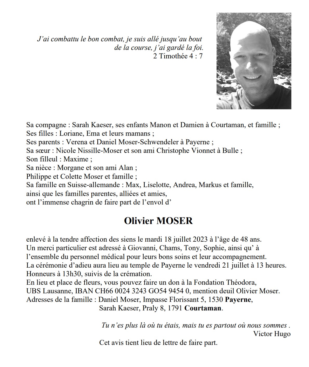 Olivier MOSER 14 mar. 1975 - 18 juil. 2023 Avis mortuaire PFG Télecharger PDF Partager sur: Galerie PreviousNext PreviousNext