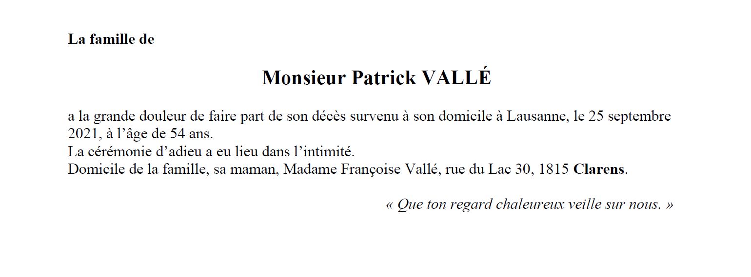 Patrick Vallé 31 mai. 1967 - 25 sep. 2021 Avis mortuaire PFG Télecharger PDF Partager sur: Galerie PreviousNext PreviousNext