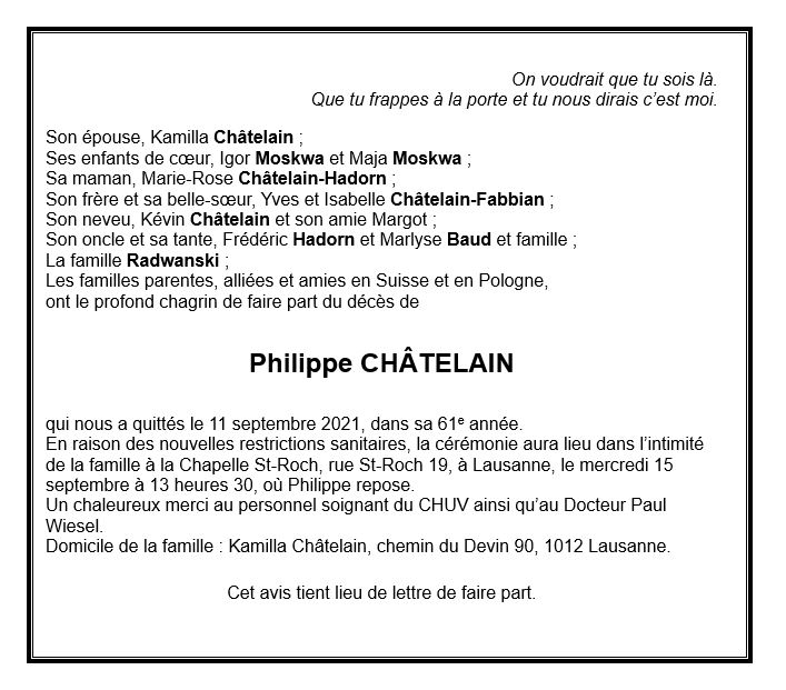 Philippe CHÂTELAIN 21 nov. 1960 - 11 sep. 2021 Avis mortuaire PFG Télecharger PDF Partager sur: Galerie PreviousNext PreviousNext