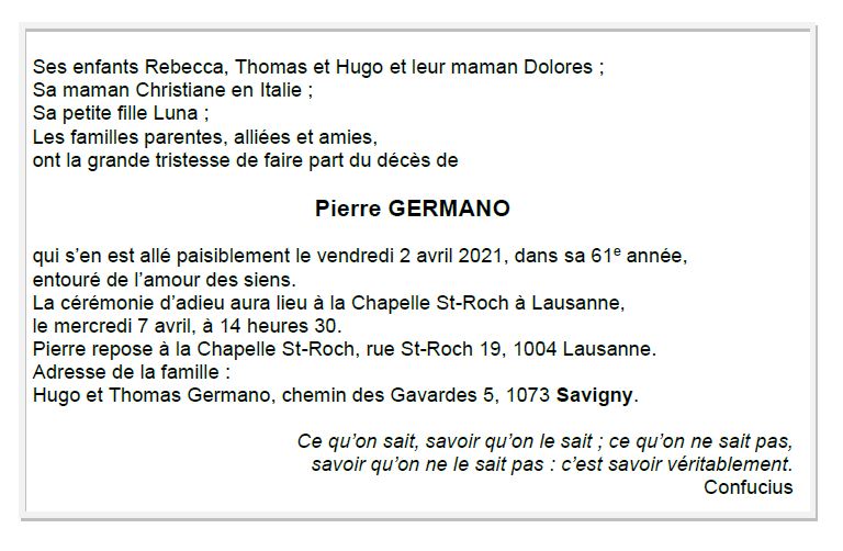 Pierre GERMANO 13 juil. 1960 - 02 avr. 2021 Avis mortuaire PFG Télecharger PDF Partager sur: Galerie PreviousNext PreviousNext