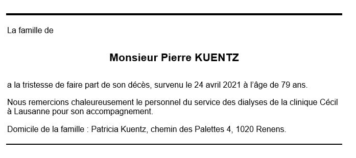 Pierre KUENTZ 17 déc. 1941 - 24 avr. 2021 Avis mortuaire PFG Télecharger PDF Partager sur: Galerie PreviousNext PreviousNext