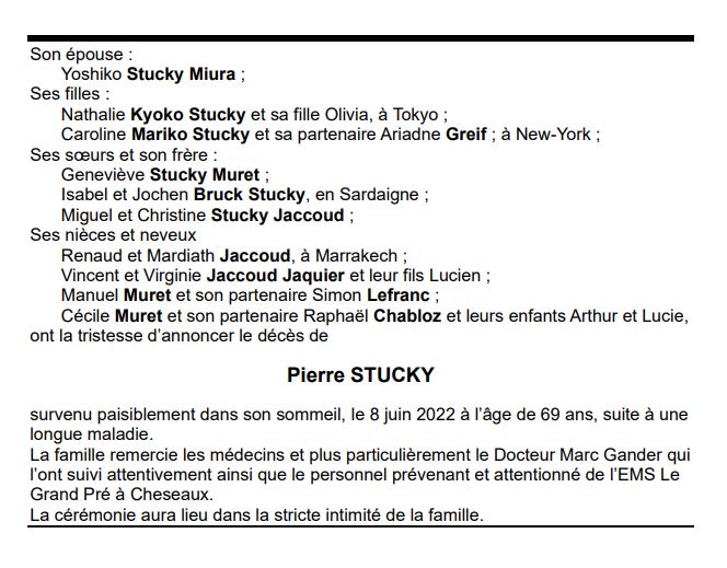 Pierre STUCKY 16 nov. 1952 - 08 juin. 2022 Avis mortuaire PFG Télecharger PDF Partager sur: Galerie PreviousNext PreviousNext