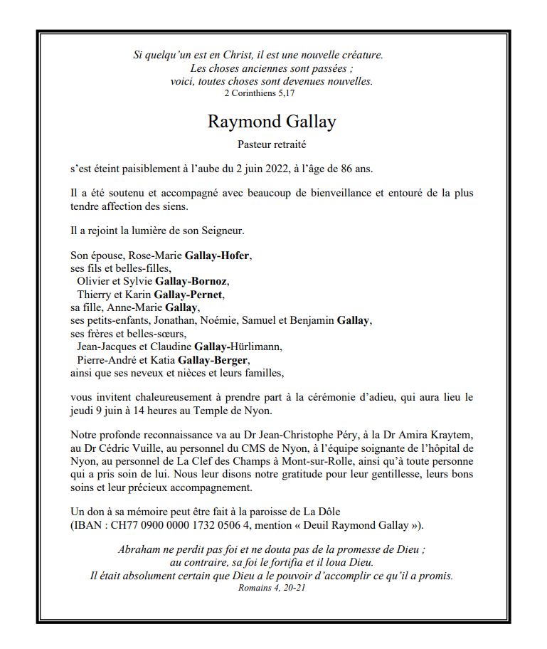 Raymond Gallay 01 avr. 0936 - 02 juin. 2022 Avis mortuaire PFG Télecharger PDF Partager sur: Galerie PreviousNext PreviousNext