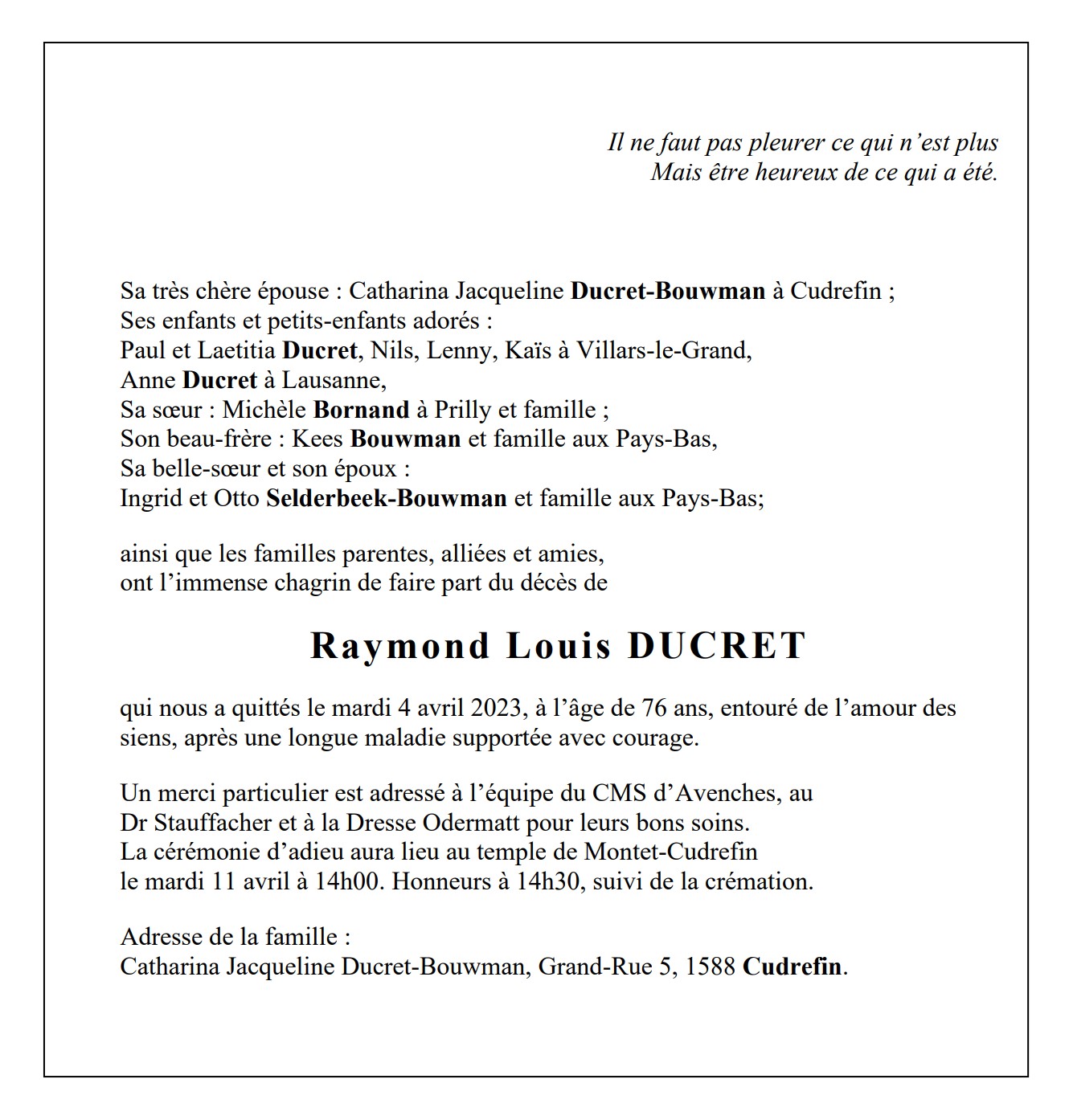 Raymond Louis DUCRET 03 juin. 1946 - 04 avr. 2023 Avis mortuaire PFG Télecharger PDF Partager sur: Galerie PreviousNext PreviousNext