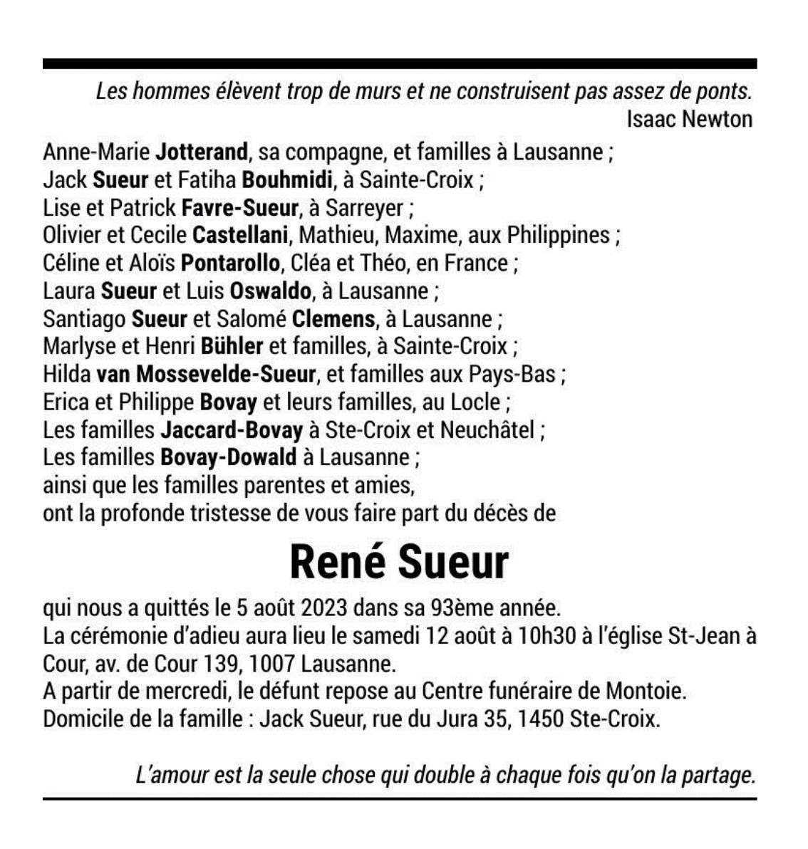 René Sueur 28 avr. 1931 - 05 aoû. 2023 Avis mortuaire PFG Télecharger PDF Partager sur: Galerie PreviousNext PreviousNext