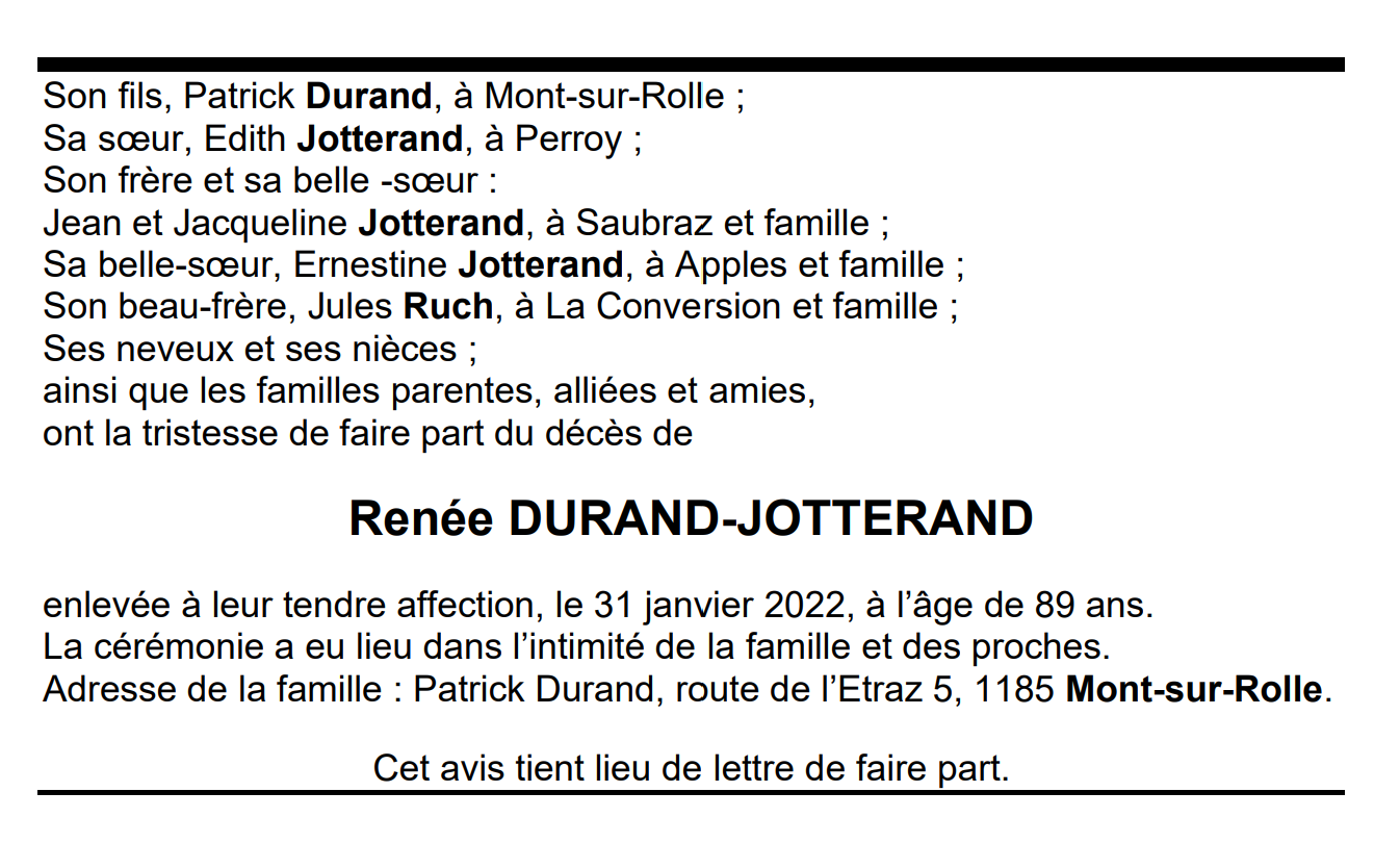 Renée DURAND-JOTTERAND 21 jan. 1933 - 31 jan. 2022 Avis mortuaire PFG Télecharger PDF Partager sur: Galerie PreviousNext PreviousNext