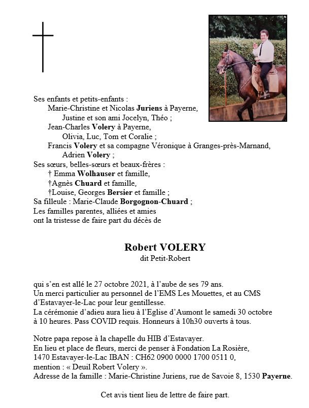 Robert VOLERY 25 déc. 1942 - 27 oct. 2021 Avis mortuaire PFG Télecharger PDF Partager sur: Galerie PreviousNext PreviousNext