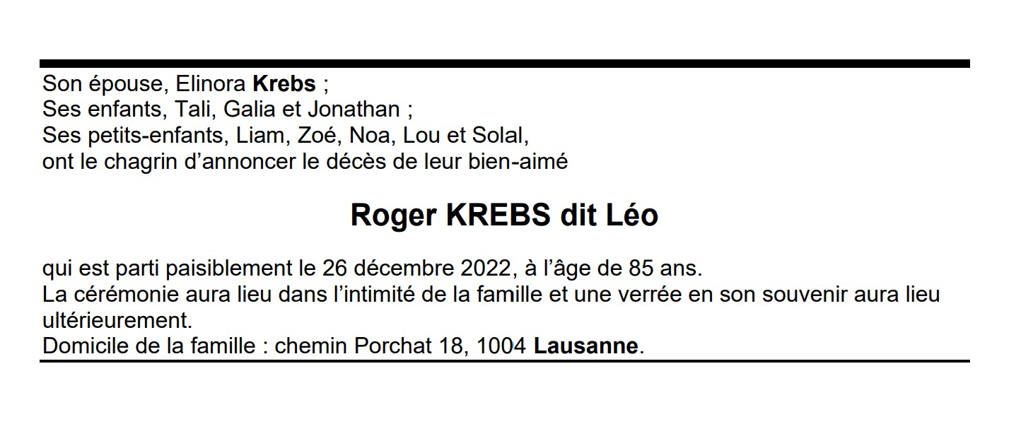 Roger KREBS 04 mar. 1937 - 26 déc. 2022 Avis mortuaire PFG Télecharger PDF Partager sur: Galerie PreviousNext PreviousNext
