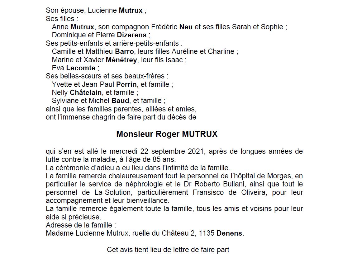 Roger Mutrux 29 juil. 1936 - 22 sep. 2021 Avis mortuaire PFG Télecharger PDF Partager sur: Galerie PreviousNext PreviousNext
