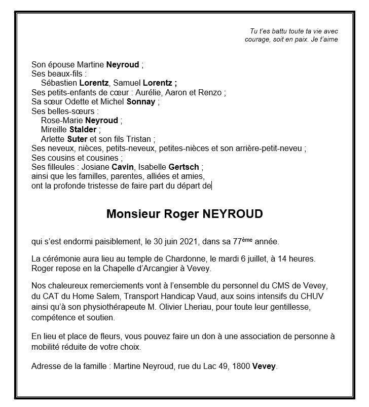 Roger NEYROUD 09 jan. 1945 - 30 juin. 2021 Avis mortuaire PFG Télecharger PDF Partager sur: Galerie PreviousNext PreviousNext