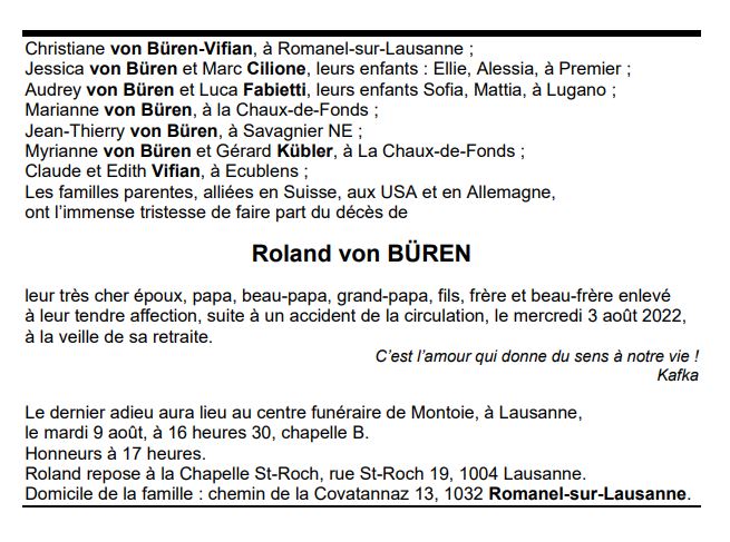 Roland von BÜREN 07 oct. 1957 - 03 aoû. 2022 Avis mortuaire PFG Télecharger PDF Partager sur: Galerie PreviousNext PreviousNext