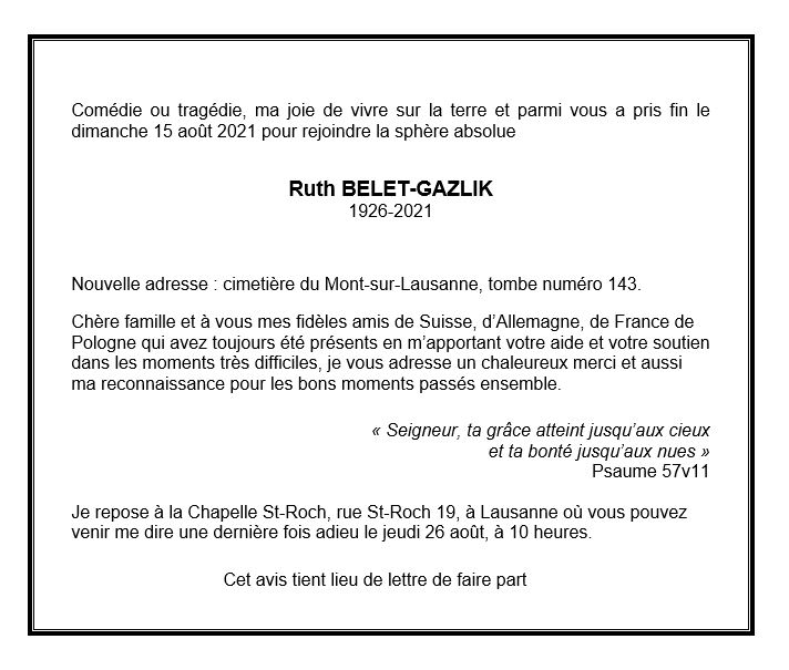 Ruth BELET-GAZLIK 30 juil. 1926 - 15 aoû. 2021 Avis mortuaire PFG Télecharger PDF Partager sur: Galerie PreviousNext PreviousNext