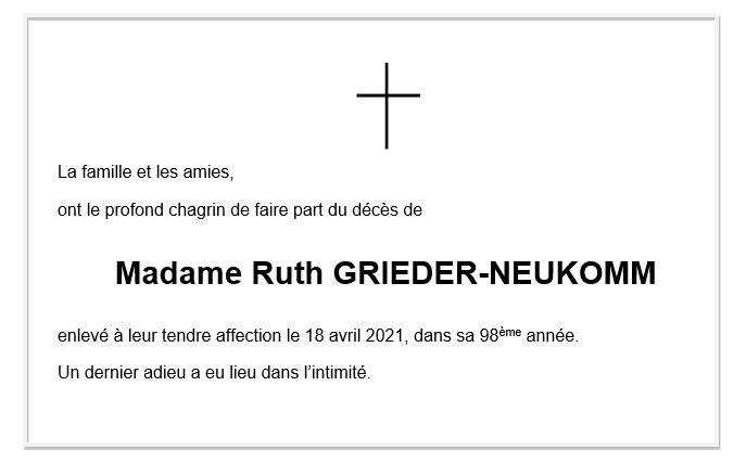 Ruth GRIEDER-NEUKOMM 18 avr. 2021 Avis mortuaire PFG Télecharger PDF Partager sur: Galerie PreviousNext PreviousNext