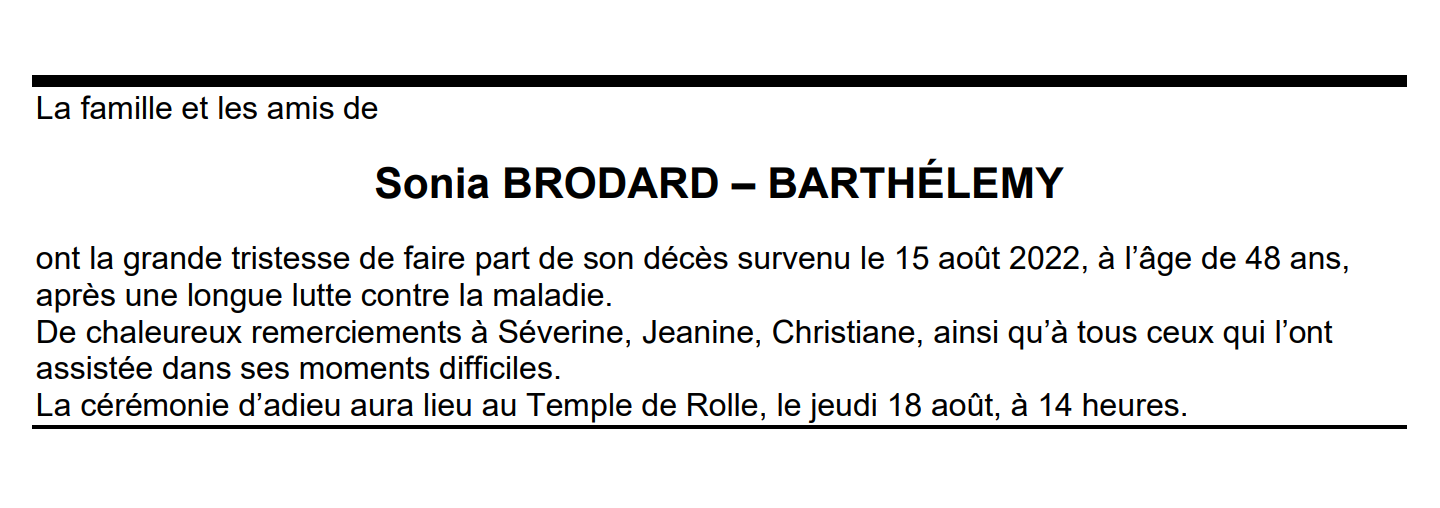 Sonia BRODARD – BARTHÉLEMY 23 jan. 1974 - 15 aoû. 2022 Avis mortuaire PFG Télecharger PDF Partager sur: Galerie PreviousNext PreviousNext
